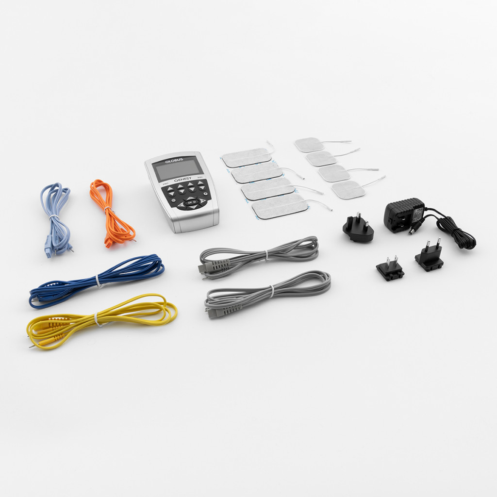 Inbegrepen in de prijs: apparaat, 4 kabels, 2 kabels voor microstroombehandeling, 4 stuks 50x50 mm en 4 stuks 50x90 mm TENS-elektroden, acculader, draagtas