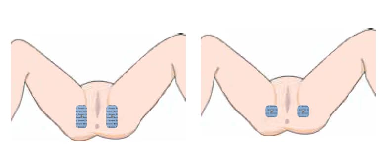 Je kunt zowel grote (bijv. 50x90 mm) als kleinere (bijv. 50x50 mm) zelfklevende elektroden gebruiken. Plaats de elektroden aan beide zijden in de liesplooi. Positioneer ze zo dat de vagina- of anusopening tussen de elektroden ligt. Houd ongeveer een handbreedte afstand tussen de twee elektroden. Start het stimulatieprogramma dat bij de vorm van incontinentie hoort en verhoog de impuls totdat duidelijke samentrekkingen in de bekkenbodemspieren optreden.
