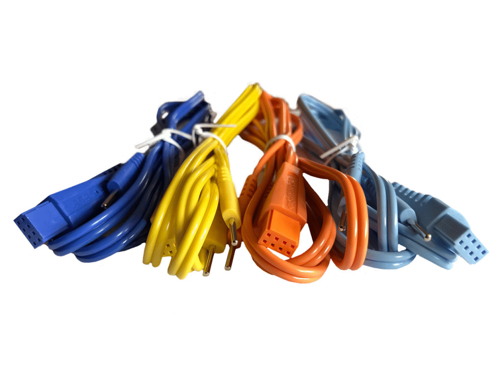 Patiëntkabelset voor Globus 4-kanaals elektrotherapie-apparaten. Bij een nieuw apparaat hoeft u deze niet apart te bestellen, want hij wordt meegeleverd met het apparaat.