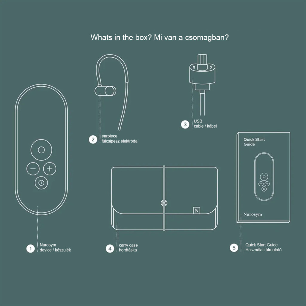 Inbegrepen in de prijs: Nurosym-apparaat, 1x oorelektrode, 1x oplaadkabel, 1x draagtas