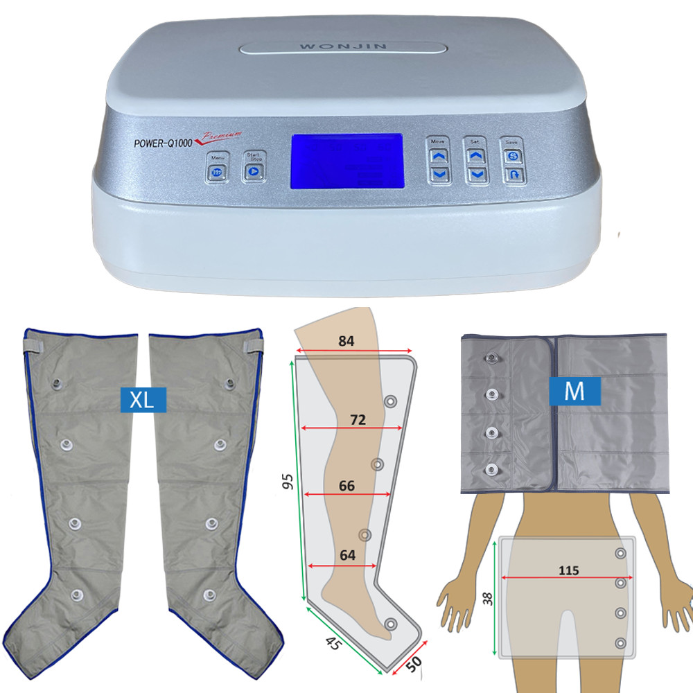 Q-1000 Premium lymfoedeem-behandeling voor been en heup/bil — complete set met lymfmassageapparaat. Inclusief XL- formaat beenspaar en M-formaat taillemanchetten. Geschikt voor thuisgebruik en professioneel gebruik.
