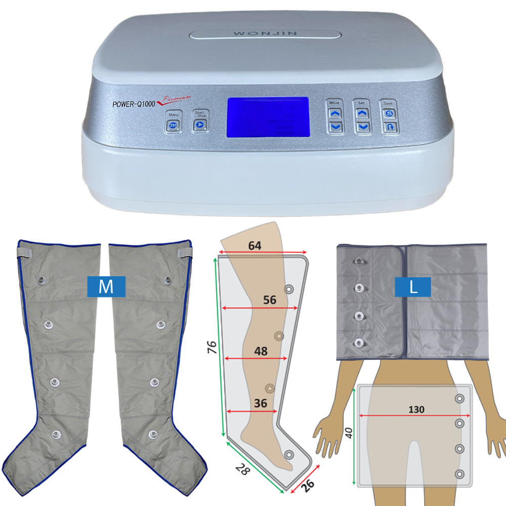 Set voor behandeling van benen en heup/billen met normale maat beenmanchetten (M) en een grote riemmanchet (L). Prijs inclusief: Power Q-1000 Premium apparaat (1 stuk); Beenmanchet: M maat (1 paar = 2 benen); Riemmanchet: L maat (1 stuk); Luchtleiding: 4-uitgangen (1 stuk); 2x4-uitgangen (1 stuk), verdeelstuk (1 stuk).