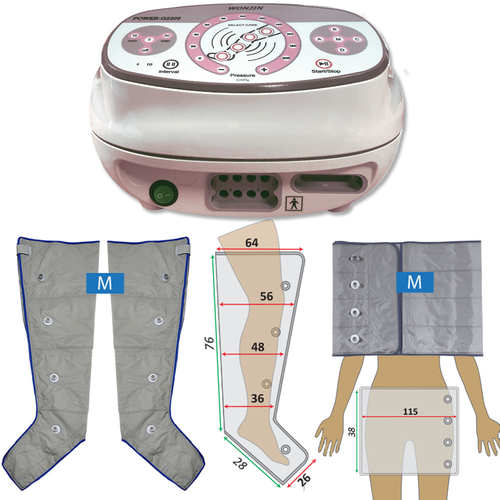 Q-2200 lymfoedeem behandeling voor been en heup/bil, compleet lymfo-drainageapparaat met M-maat beenen en M tailleband-manchetten. Geschikt voor thuisgebruik en professioneel gebruik.