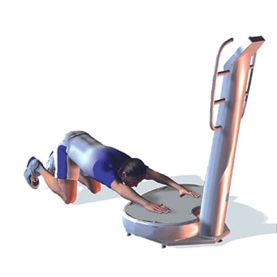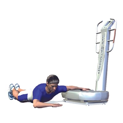 Beginsituatie: Ga op je buik liggen voor de vibratietrainer, voeten bij elkaar, plaats één arm op het plateau.