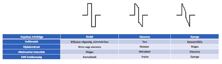 De ‘ziel’ van TENS en elke andere elektrotherapie is de impuls. Vele medische studies tonen aan dat een van de belangrijkste elementen van effectieve TENS is een zo perfect mogelijke rechthoekige impuls. De vorm van de impulsen die goedkope apparaten leveren, benadert die rechthoek niet eens (zie de illustratie).